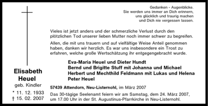 Hier finden Sie alle Traueranzeigen aus der Zeitung, die bisher für Elisabeth Heuel erschienen sind. Weitere Traueranzeigen, die in der Zeitung erscheinen, werden hier ebenfalls aufgelistet