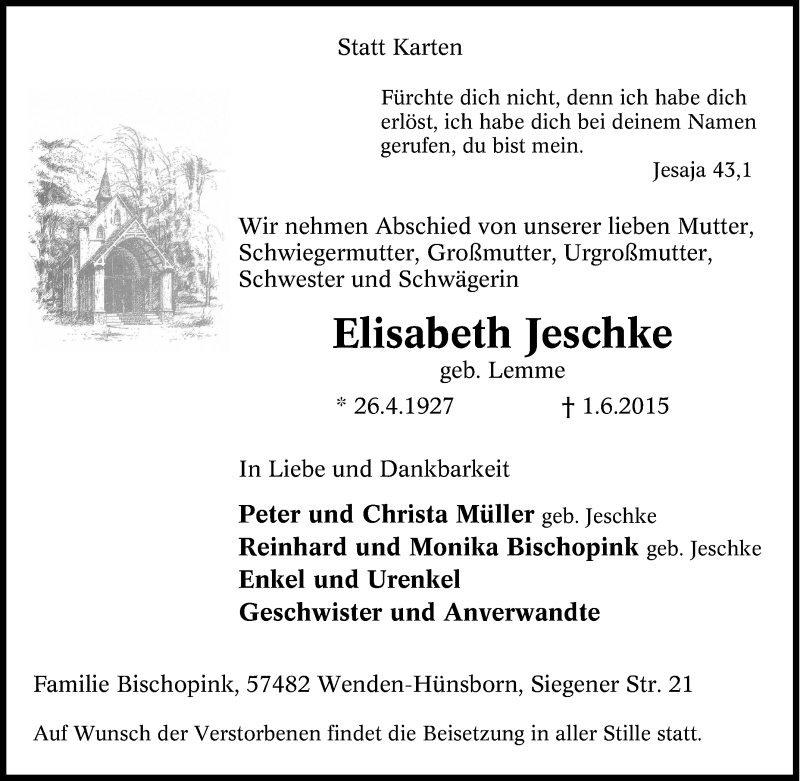 Hier finden Sie alle Traueranzeigen aus der Zeitung, die bisher für Elisabeth Jeschke erschienen sind. Weitere Traueranzeigen, die in der Zeitung erscheinen, werden hier ebenfalls aufgelistet
