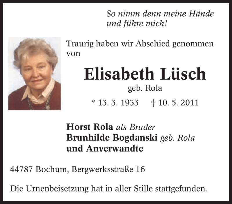 Hier finden Sie alle Traueranzeigen aus der Zeitung, die bisher für Elisabeth Lüsch erschienen sind. Weitere Traueranzeigen, die in der Zeitung erscheinen, werden hier ebenfalls aufgelistet