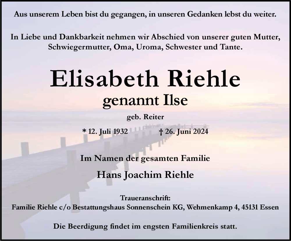 Hier finden Sie alle Traueranzeigen aus der Zeitung, die bisher für Elisabeth Riehle erschienen sind. Weitere Traueranzeigen, die in der Zeitung erscheinen, werden hier ebenfalls aufgelistet