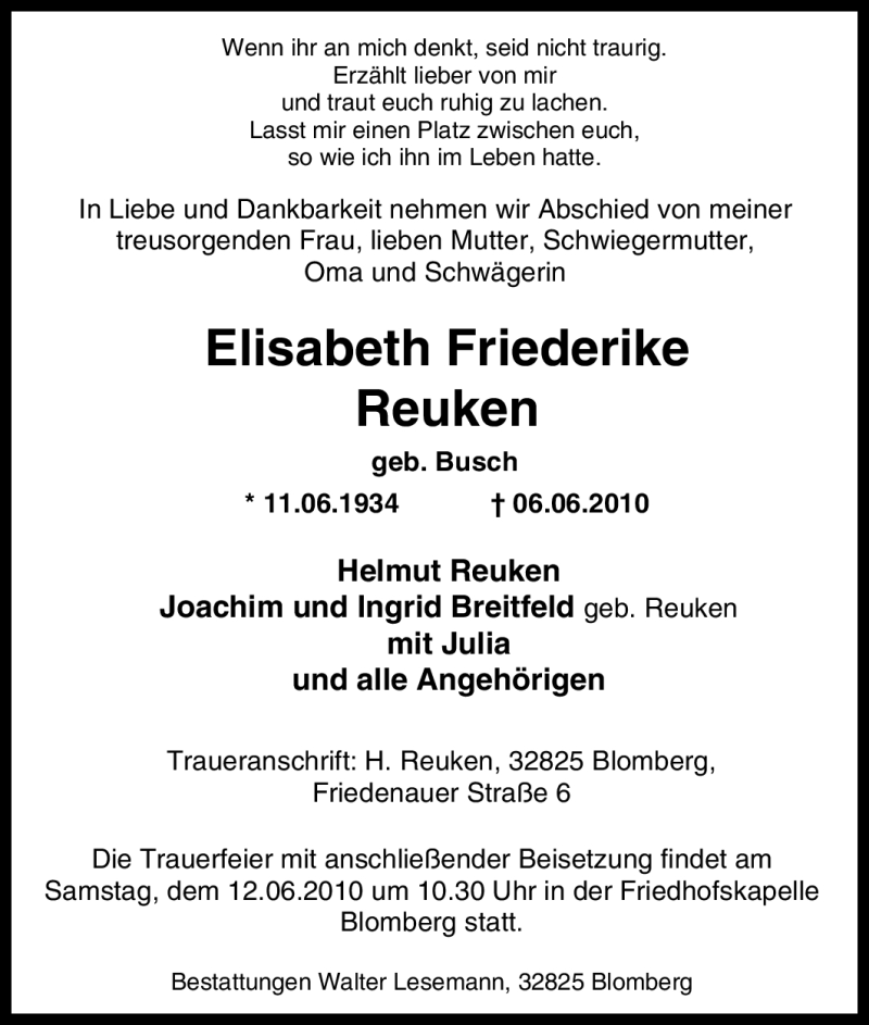 Hier finden Sie alle Traueranzeigen aus der Zeitung, die bisher für Elisabeth Friederike Reuken erschienen sind. Weitere Traueranzeigen, die in der Zeitung erscheinen, werden hier ebenfalls aufgelistet