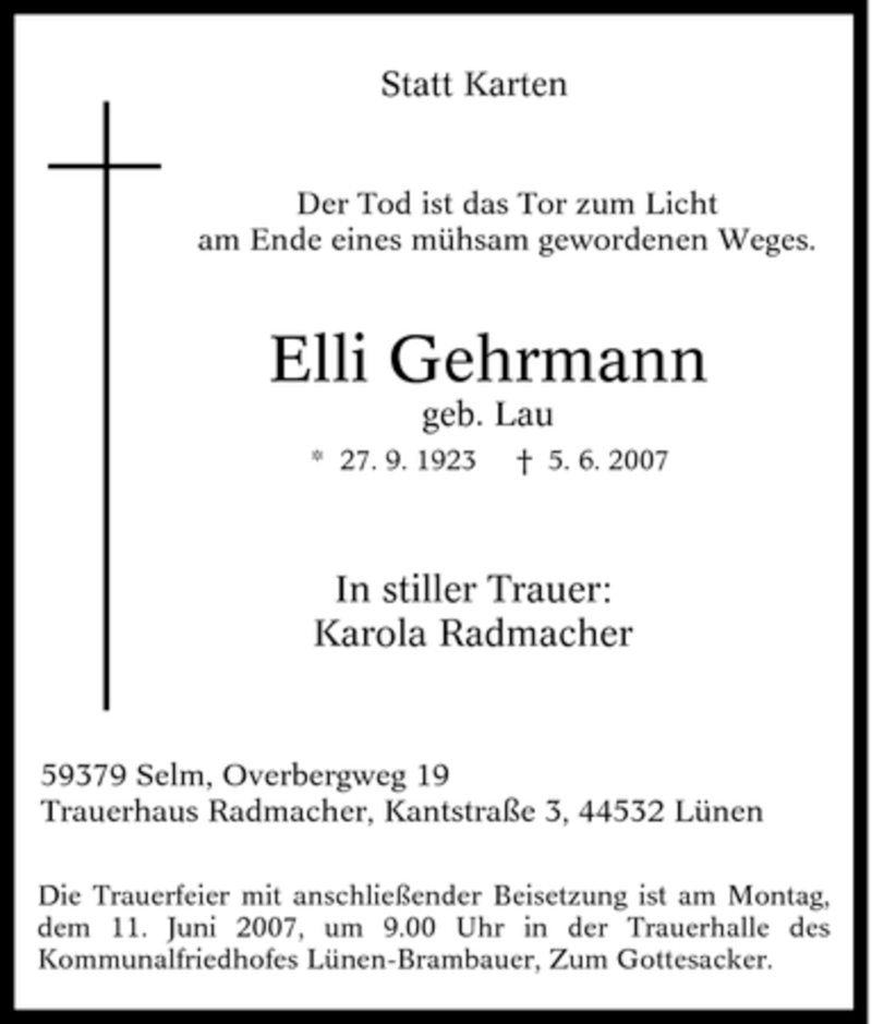 Hier finden Sie alle Traueranzeigen aus der Zeitung, die bisher für Elli Gehrmann erschienen sind. Weitere Traueranzeigen, die in der Zeitung erscheinen, werden hier ebenfalls aufgelistet