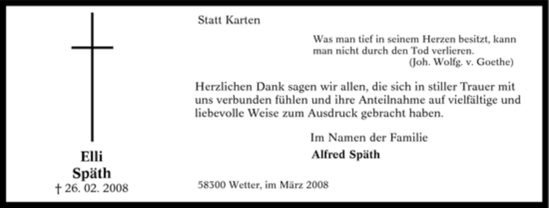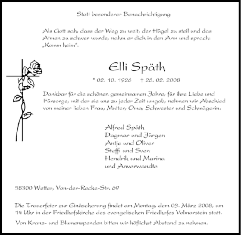 Hier finden Sie alle Traueranzeigen aus der Zeitung, die bisher für Elli Späth erschienen sind. Weitere Traueranzeigen, die in der Zeitung erscheinen, werden hier ebenfalls aufgelistet