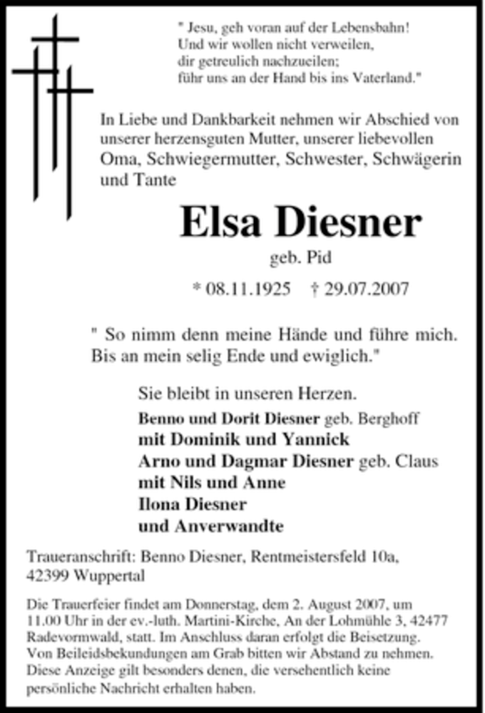 Hier finden Sie alle Traueranzeigen aus der Zeitung, die bisher für Elsa Diesner erschienen sind. Weitere Traueranzeigen, die in der Zeitung erscheinen, werden hier ebenfalls aufgelistet