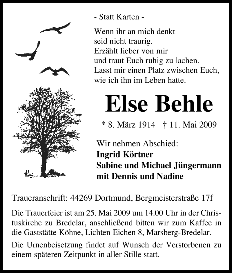 Hier finden Sie alle Traueranzeigen aus der Zeitung, die bisher für Else Behle erschienen sind. Weitere Traueranzeigen, die in der Zeitung erscheinen, werden hier ebenfalls aufgelistet