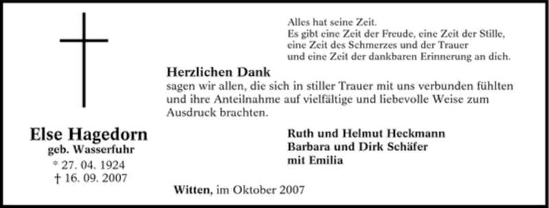 Hier finden Sie alle Traueranzeigen aus der Zeitung, die bisher für Else Hagedorn erschienen sind. Weitere Traueranzeigen, die in der Zeitung erscheinen, werden hier ebenfalls aufgelistet