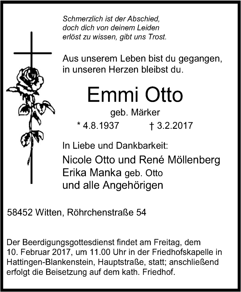 Hier finden Sie alle Traueranzeigen aus der Zeitung, die bisher für Emmi Otto erschienen sind. Weitere Traueranzeigen, die in der Zeitung erscheinen, werden hier ebenfalls aufgelistet