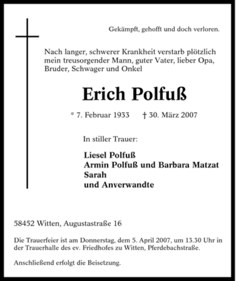 Hier finden Sie alle Traueranzeigen aus der Zeitung, die bisher für Erich Polfuß erschienen sind. Weitere Traueranzeigen, die in der Zeitung erscheinen, werden hier ebenfalls aufgelistet
