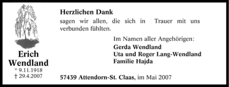 Hier finden Sie alle Traueranzeigen aus der Zeitung, die bisher für Erich Wendland erschienen sind. Weitere Traueranzeigen, die in der Zeitung erscheinen, werden hier ebenfalls aufgelistet