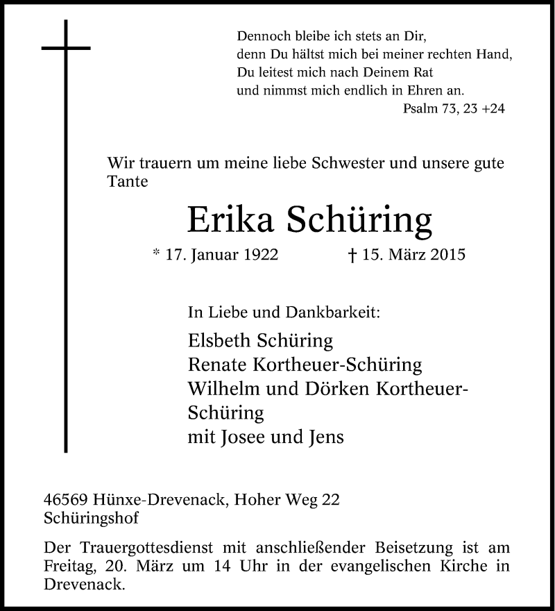 Hier finden Sie alle Traueranzeigen aus der Zeitung, die bisher für Erika Schüring erschienen sind. Weitere Traueranzeigen, die in der Zeitung erscheinen, werden hier ebenfalls aufgelistet