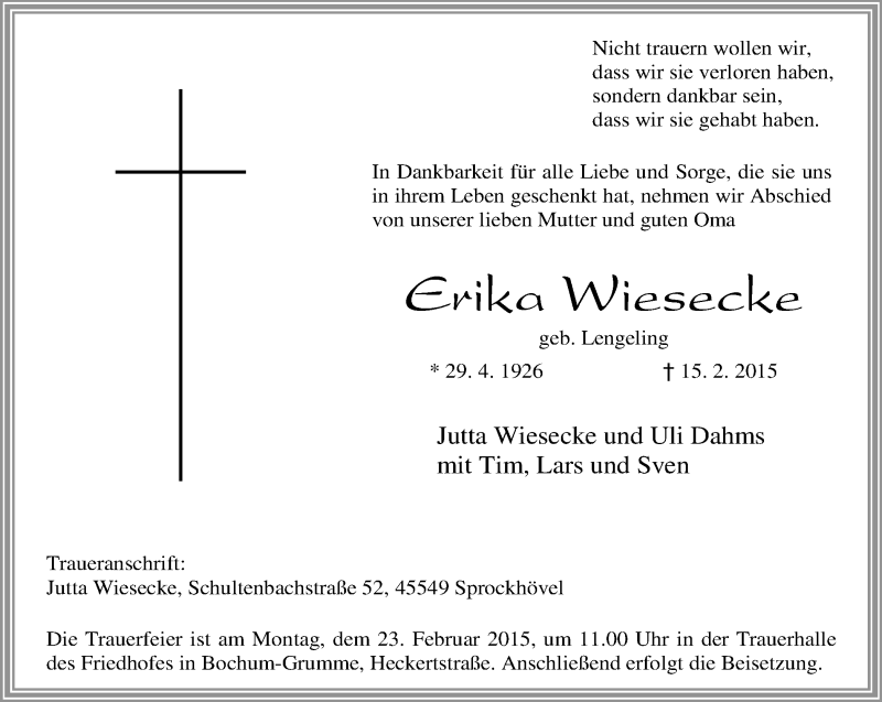 Hier finden Sie alle Traueranzeigen aus der Zeitung, die bisher für Erika Wiesecke erschienen sind. Weitere Traueranzeigen, die in der Zeitung erscheinen, werden hier ebenfalls aufgelistet