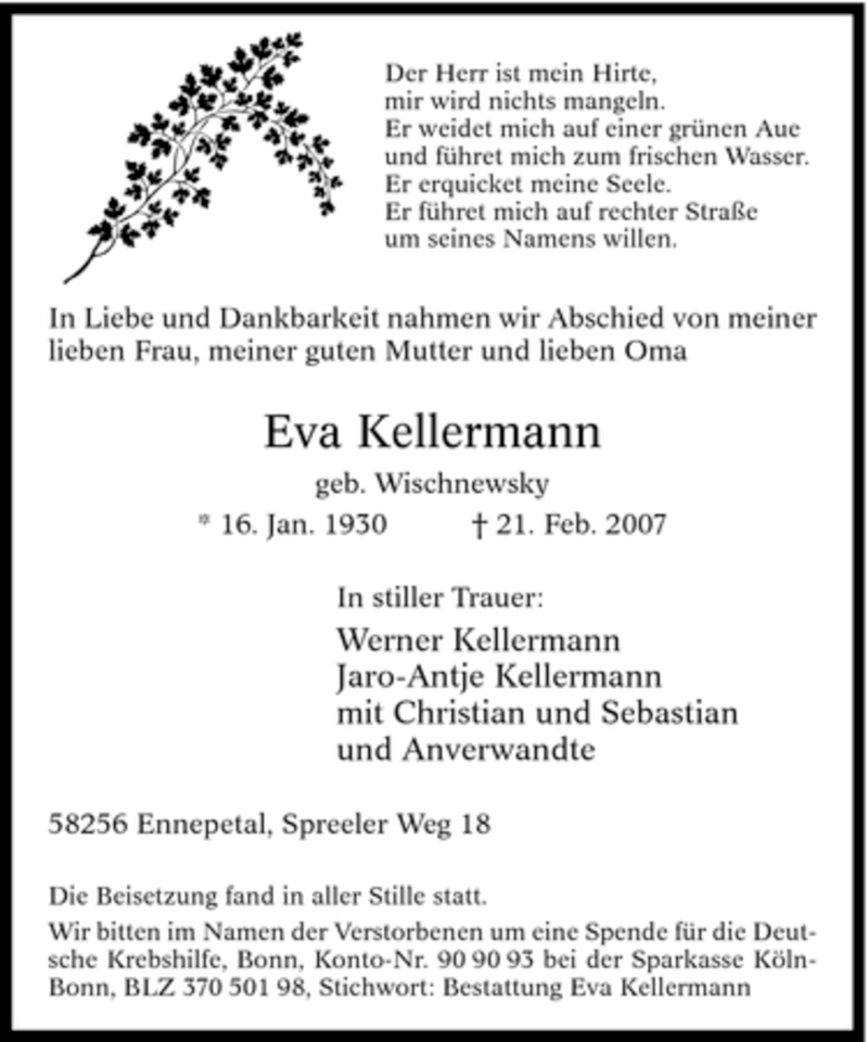 Hier finden Sie alle Traueranzeigen aus der Zeitung, die bisher für Eva Kellermann erschienen sind. Weitere Traueranzeigen, die in der Zeitung erscheinen, werden hier ebenfalls aufgelistet