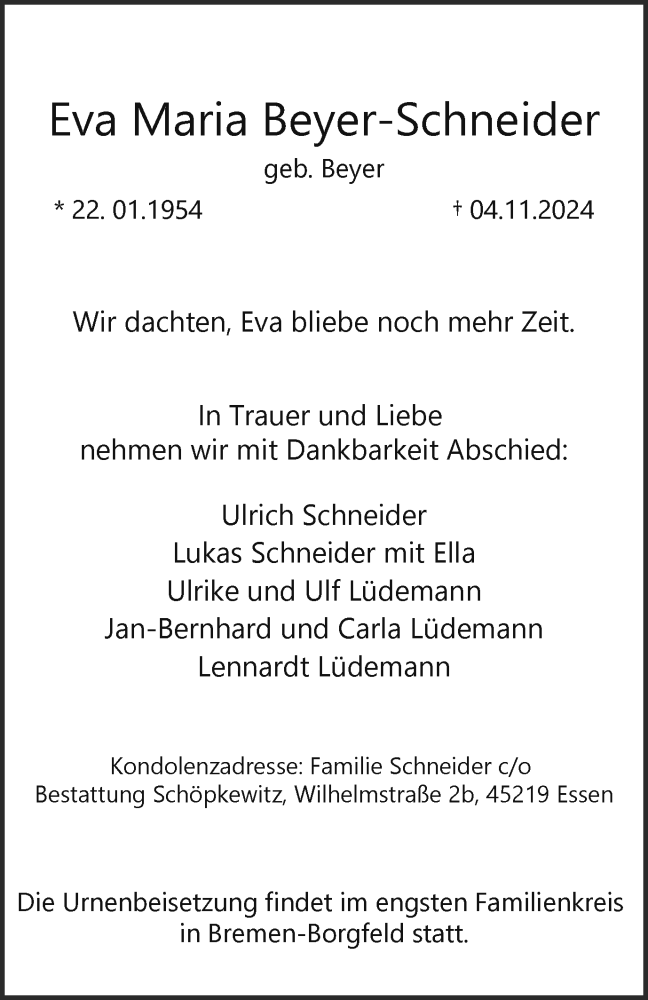 Hier finden Sie alle Traueranzeigen aus der Zeitung, die bisher für Eva Maria Beyer-Schneider erschienen sind. Weitere Traueranzeigen, die in der Zeitung erscheinen, werden hier ebenfalls aufgelistet