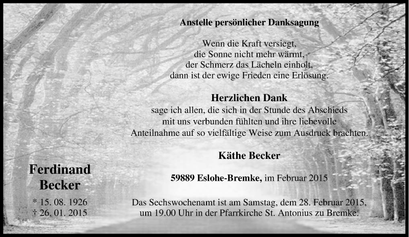 Hier finden Sie alle Traueranzeigen aus der Zeitung, die bisher für Ferdinand Becker erschienen sind. Weitere Traueranzeigen, die in der Zeitung erscheinen, werden hier ebenfalls aufgelistet