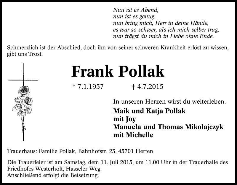 Hier finden Sie alle Traueranzeigen aus der Zeitung, die bisher für Frank Pollak erschienen sind. Weitere Traueranzeigen, die in der Zeitung erscheinen, werden hier ebenfalls aufgelistet