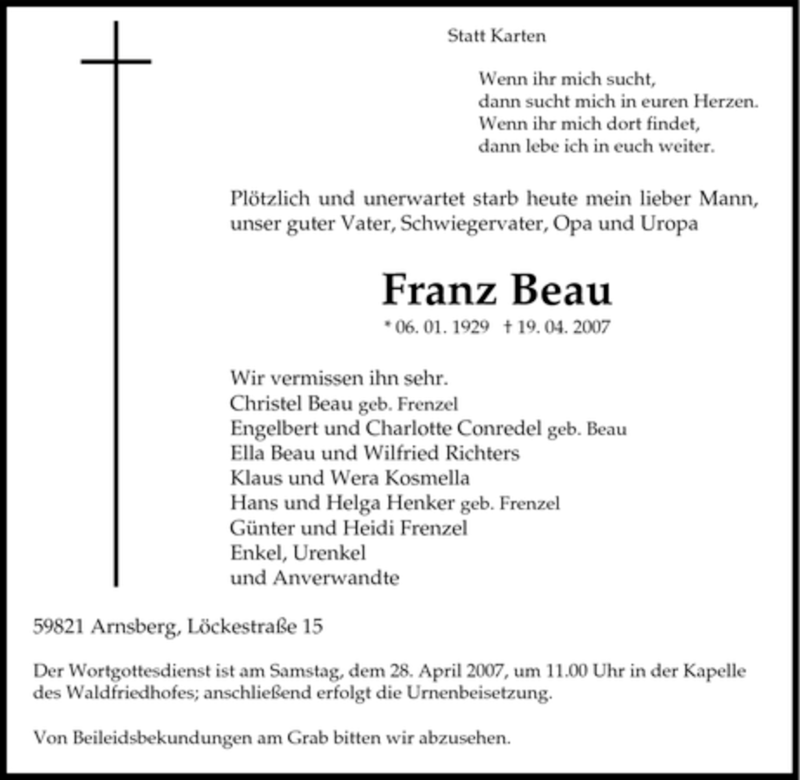 Hier finden Sie alle Traueranzeigen aus der Zeitung, die bisher für Franz Beau erschienen sind. Weitere Traueranzeigen, die in der Zeitung erscheinen, werden hier ebenfalls aufgelistet