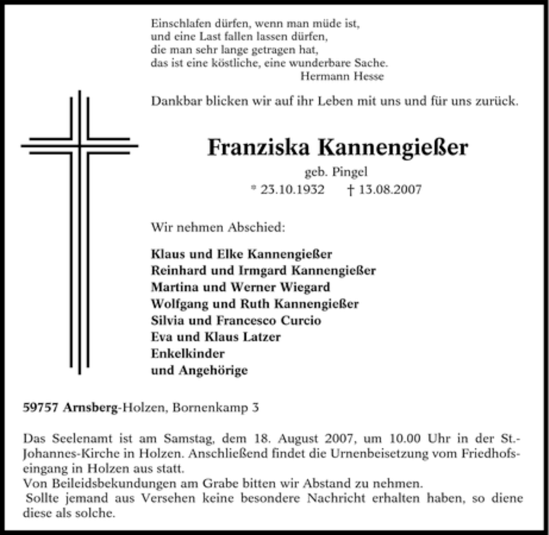 Hier finden Sie alle Traueranzeigen aus der Zeitung, die bisher für Franziska Kannengießer erschienen sind. Weitere Traueranzeigen, die in der Zeitung erscheinen, werden hier ebenfalls aufgelistet