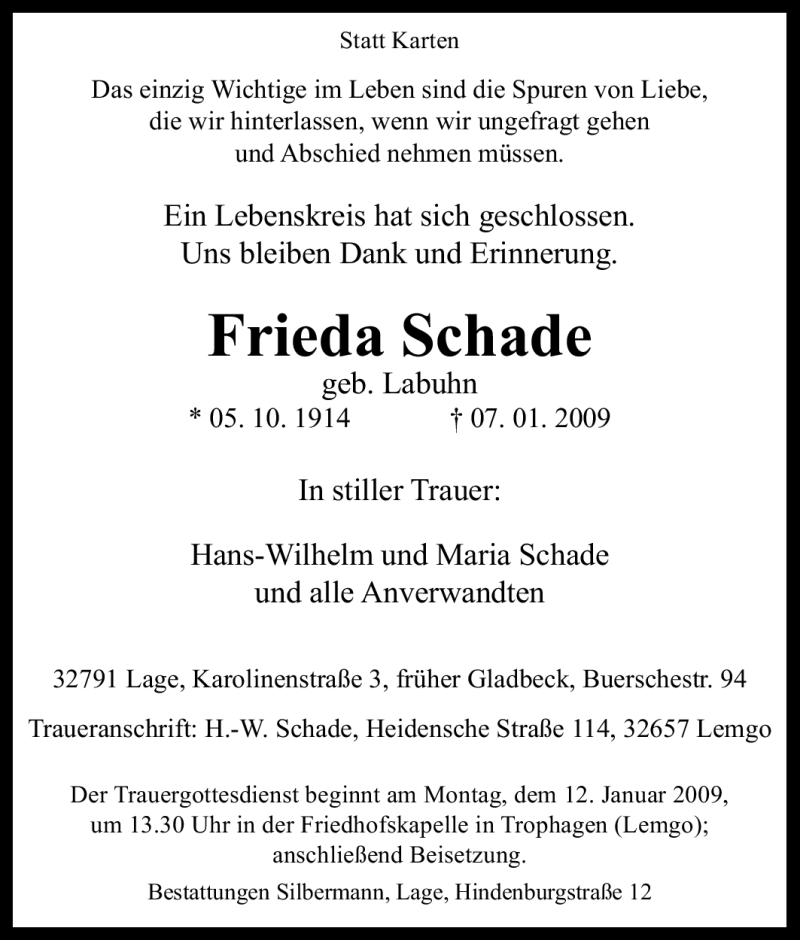 Hier finden Sie alle Traueranzeigen aus der Zeitung, die bisher für Frieda Schade erschienen sind. Weitere Traueranzeigen, die in der Zeitung erscheinen, werden hier ebenfalls aufgelistet