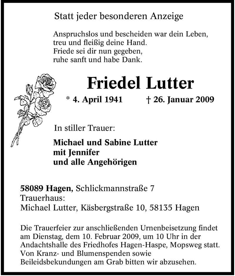 Hier finden Sie alle Traueranzeigen aus der Zeitung, die bisher für Friedel Lutter erschienen sind. Weitere Traueranzeigen, die in der Zeitung erscheinen, werden hier ebenfalls aufgelistet