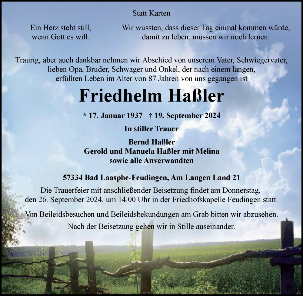 Hier finden Sie alle Traueranzeigen aus der Zeitung, die bisher für Friedhelm Haßler erschienen sind. Weitere Traueranzeigen, die in der Zeitung erscheinen, werden hier ebenfalls aufgelistet