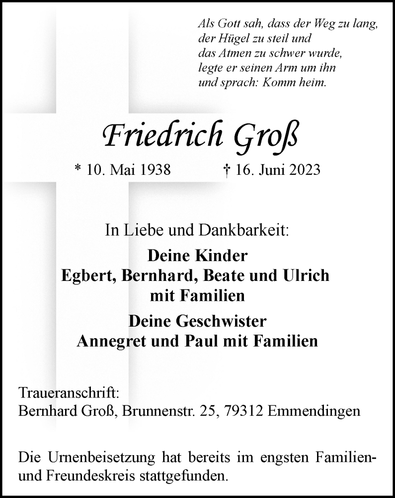 Hier finden Sie alle Traueranzeigen aus der Zeitung, die bisher für Friedrich Groß erschienen sind. Weitere Traueranzeigen, die in der Zeitung erscheinen, werden hier ebenfalls aufgelistet