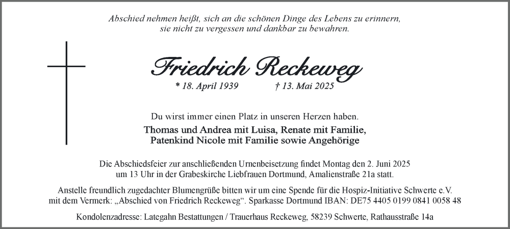 Hier finden Sie alle Traueranzeigen aus der Zeitung, die bisher für Friedrich Reckeweg erschienen sind. Weitere Traueranzeigen, die in der Zeitung erscheinen, werden hier ebenfalls aufgelistet