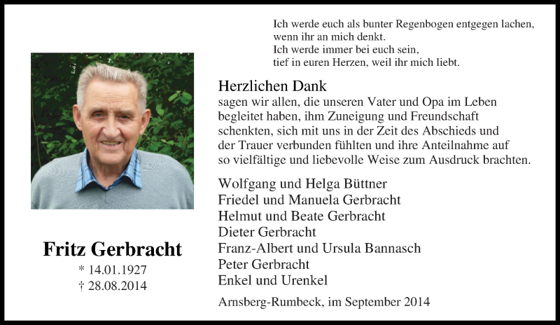 Hier finden Sie alle Traueranzeigen aus der Zeitung, die bisher für Fritz Gerbracht erschienen sind. Weitere Traueranzeigen, die in der Zeitung erscheinen, werden hier ebenfalls aufgelistet