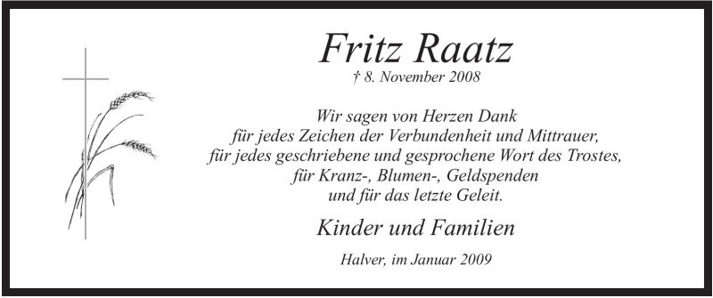 Hier finden Sie alle Traueranzeigen aus der Zeitung, die bisher für Fritz Raatz erschienen sind. Weitere Traueranzeigen, die in der Zeitung erscheinen, werden hier ebenfalls aufgelistet