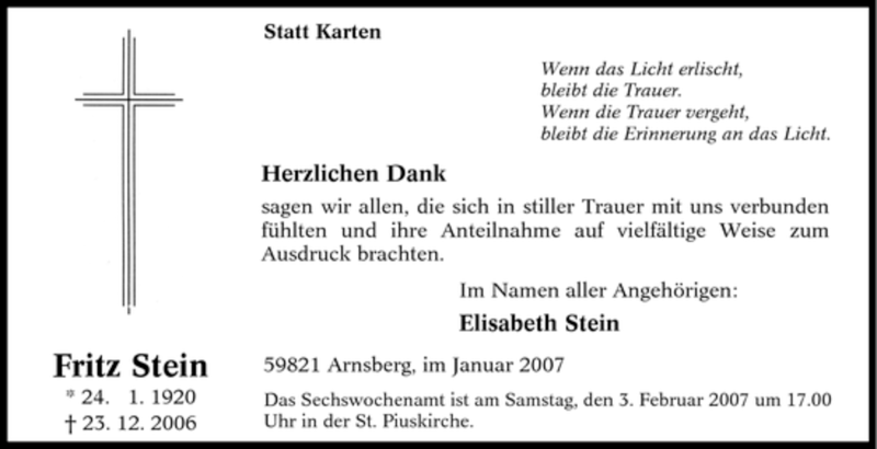 Hier finden Sie alle Traueranzeigen aus der Zeitung, die bisher für Fritz Stein erschienen sind. Weitere Traueranzeigen, die in der Zeitung erscheinen, werden hier ebenfalls aufgelistet