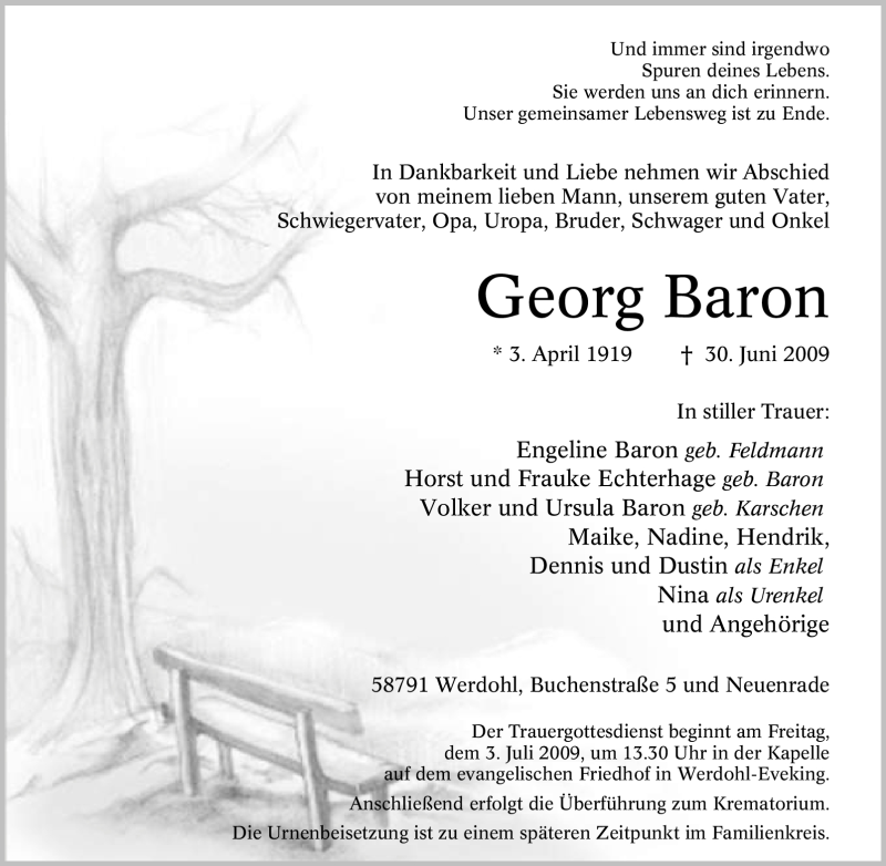 Hier finden Sie alle Traueranzeigen aus der Zeitung, die bisher für Georg Baron erschienen sind. Weitere Traueranzeigen, die in der Zeitung erscheinen, werden hier ebenfalls aufgelistet