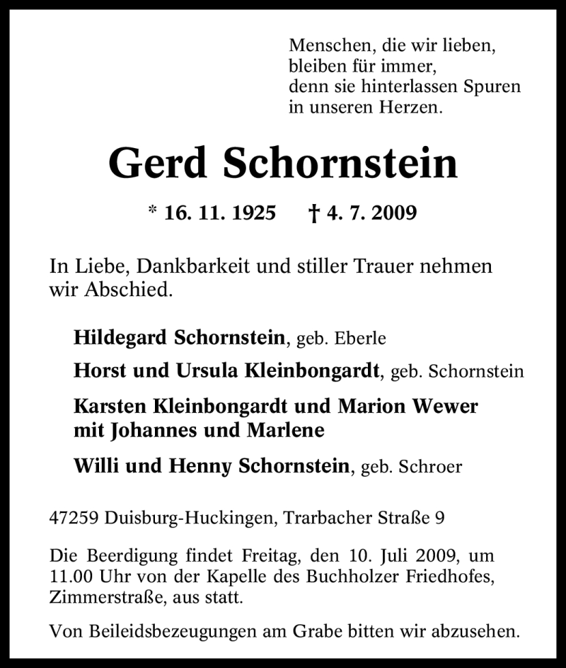 Hier finden Sie alle Traueranzeigen aus der Zeitung, die bisher für Gerd Schornstein erschienen sind. Weitere Traueranzeigen, die in der Zeitung erscheinen, werden hier ebenfalls aufgelistet