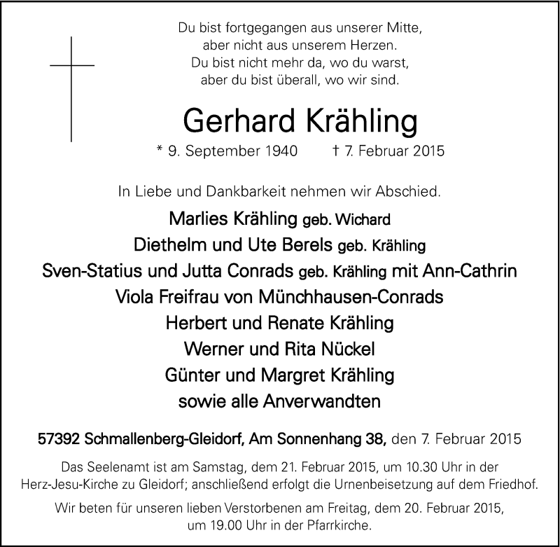 Hier finden Sie alle Traueranzeigen aus der Zeitung, die bisher für Gerhard Krähling erschienen sind. Weitere Traueranzeigen, die in der Zeitung erscheinen, werden hier ebenfalls aufgelistet