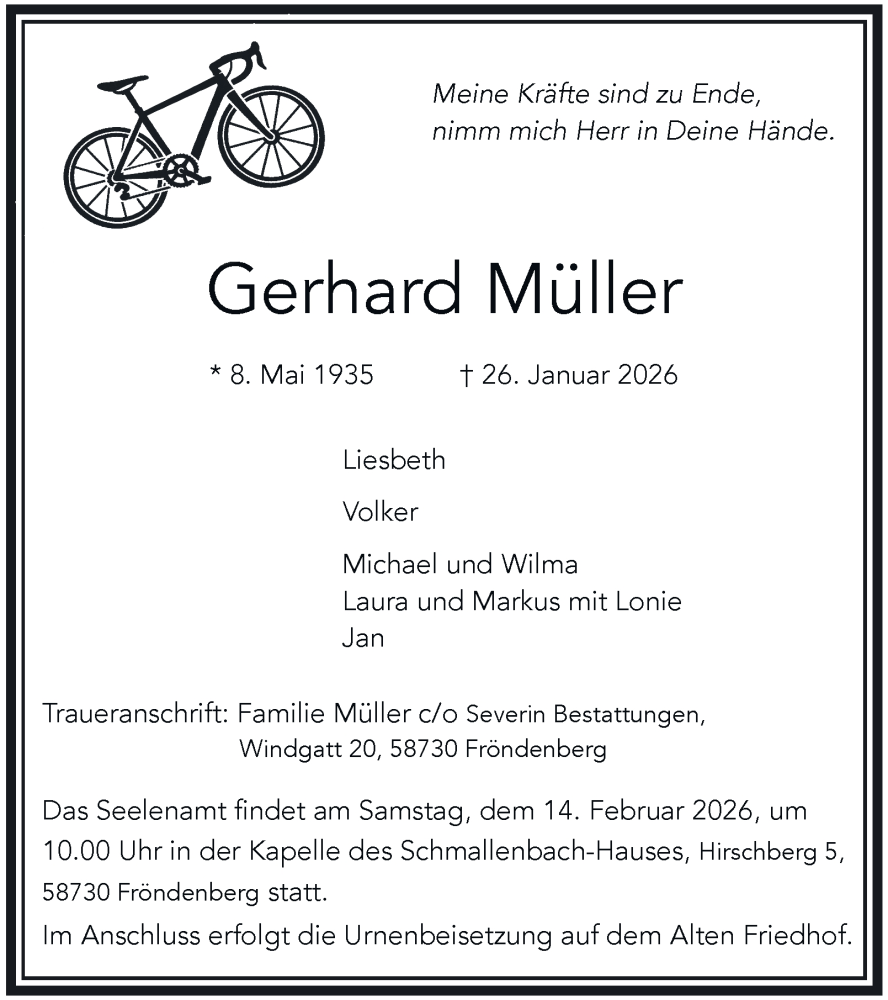 Hier finden Sie alle Traueranzeigen aus der Zeitung, die bisher für Gerhard Müller erschienen sind. Weitere Traueranzeigen, die in der Zeitung erscheinen, werden hier ebenfalls aufgelistet