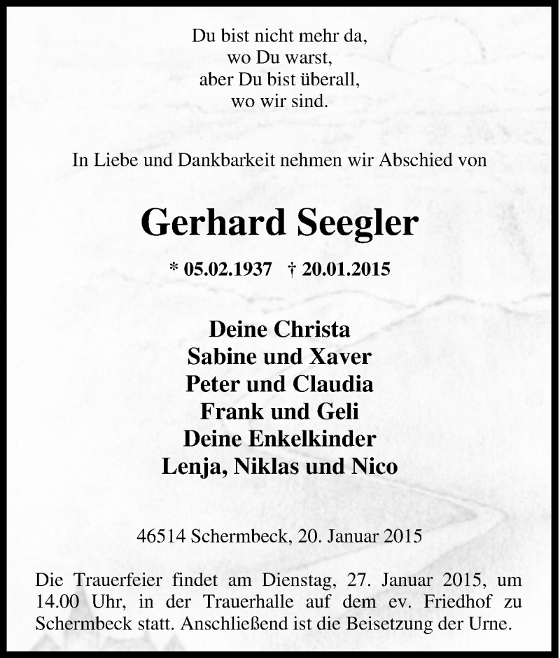 Hier finden Sie alle Traueranzeigen aus der Zeitung, die bisher für Gerhard Seegler erschienen sind. Weitere Traueranzeigen, die in der Zeitung erscheinen, werden hier ebenfalls aufgelistet