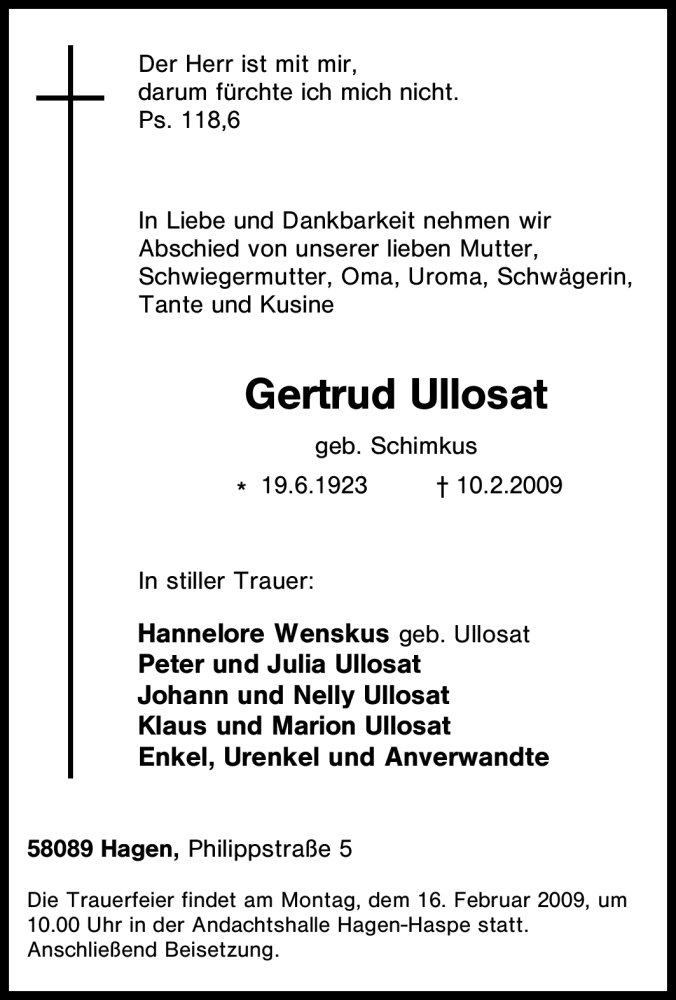 Hier finden Sie alle Traueranzeigen aus der Zeitung, die bisher für Gertrud Ullosat erschienen sind. Weitere Traueranzeigen, die in der Zeitung erscheinen, werden hier ebenfalls aufgelistet