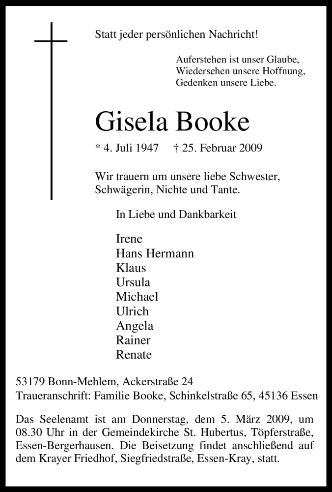 Hier finden Sie alle Traueranzeigen aus der Zeitung, die bisher für Gisela Booke erschienen sind. Weitere Traueranzeigen, die in der Zeitung erscheinen, werden hier ebenfalls aufgelistet
