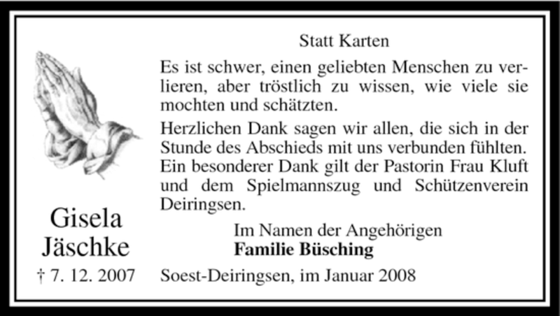 Hier finden Sie alle Traueranzeigen aus der Zeitung, die bisher für Gisela Jäschke erschienen sind. Weitere Traueranzeigen, die in der Zeitung erscheinen, werden hier ebenfalls aufgelistet