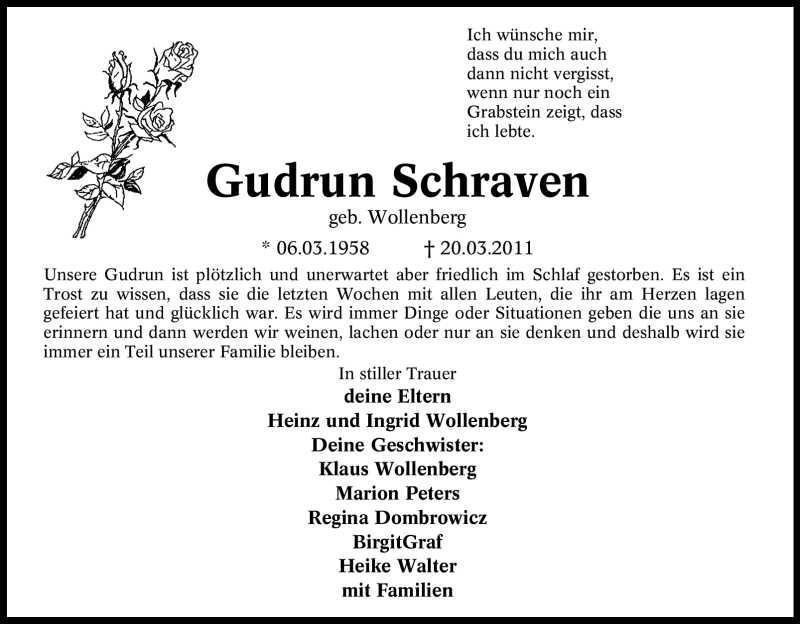 Hier finden Sie alle Traueranzeigen aus der Zeitung, die bisher für Gudrun Schraven erschienen sind. Weitere Traueranzeigen, die in der Zeitung erscheinen, werden hier ebenfalls aufgelistet