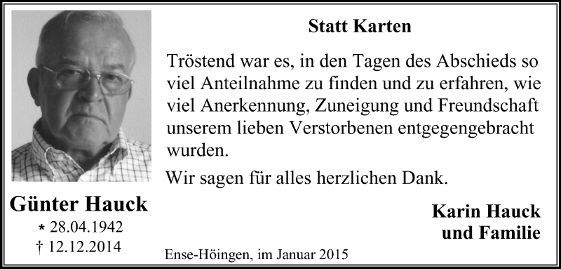 Hier finden Sie alle Traueranzeigen aus der Zeitung, die bisher für Günter Hauck erschienen sind. Weitere Traueranzeigen, die in der Zeitung erscheinen, werden hier ebenfalls aufgelistet