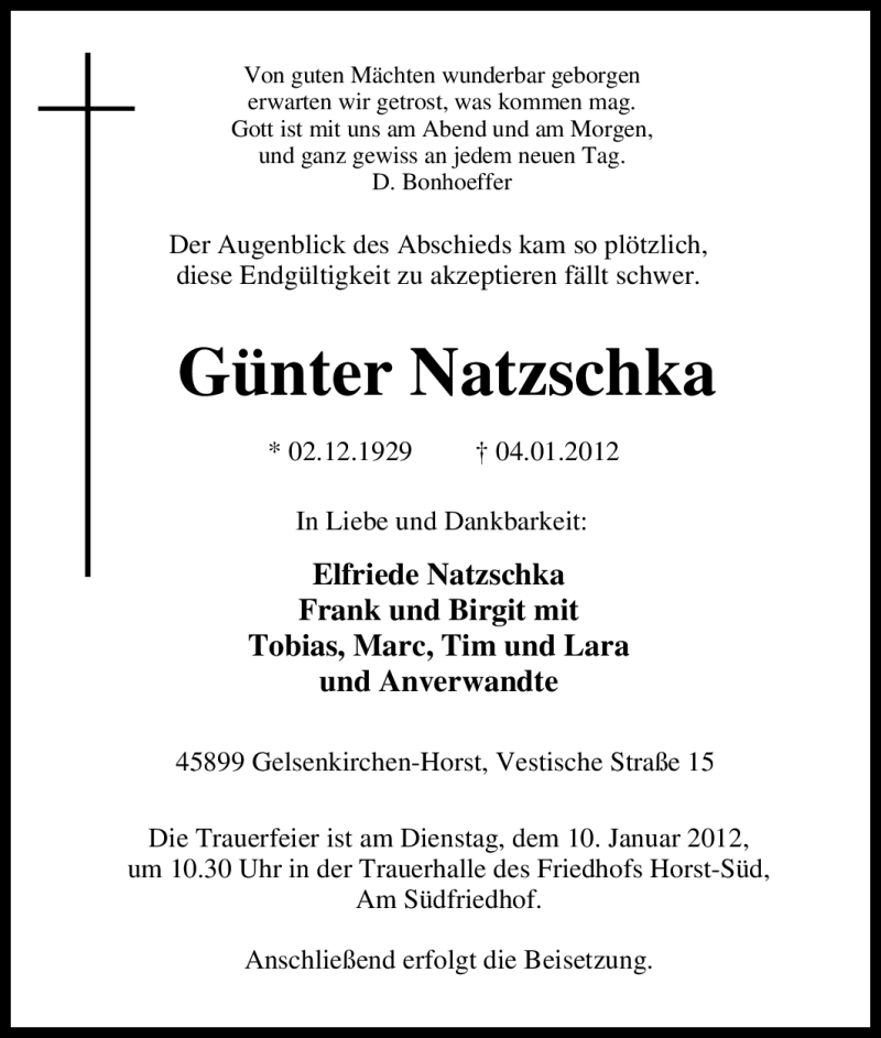Hier finden Sie alle Traueranzeigen aus der Zeitung, die bisher für Günter Natzschka erschienen sind. Weitere Traueranzeigen, die in der Zeitung erscheinen, werden hier ebenfalls aufgelistet