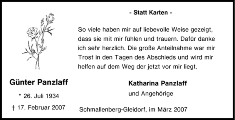 Hier finden Sie alle Traueranzeigen aus der Zeitung, die bisher für Günter Panzlaff erschienen sind. Weitere Traueranzeigen, die in der Zeitung erscheinen, werden hier ebenfalls aufgelistet