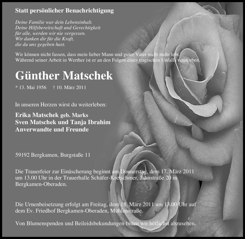 Hier finden Sie alle Traueranzeigen aus der Zeitung, die bisher für Günther Matschek erschienen sind. Weitere Traueranzeigen, die in der Zeitung erscheinen, werden hier ebenfalls aufgelistet