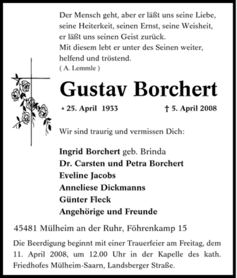 Hier finden Sie alle Traueranzeigen aus der Zeitung, die bisher für Gustav Borchert erschienen sind. Weitere Traueranzeigen, die in der Zeitung erscheinen, werden hier ebenfalls aufgelistet