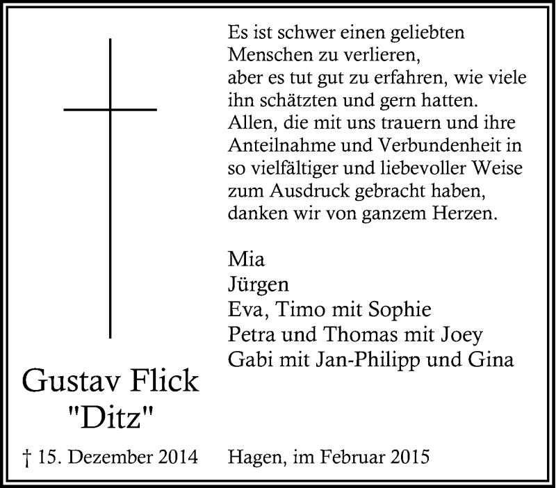 Hier finden Sie alle Traueranzeigen aus der Zeitung, die bisher für Gustav Flick erschienen sind. Weitere Traueranzeigen, die in der Zeitung erscheinen, werden hier ebenfalls aufgelistet