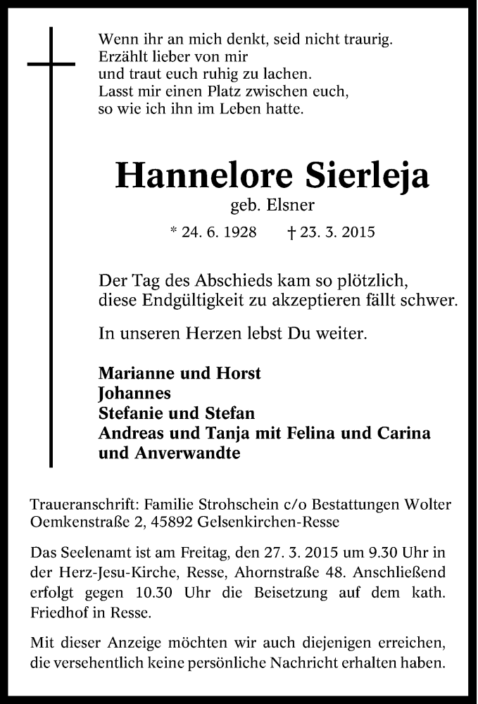 Hier finden Sie alle Traueranzeigen aus der Zeitung, die bisher für Hannelore Sierleja erschienen sind. Weitere Traueranzeigen, die in der Zeitung erscheinen, werden hier ebenfalls aufgelistet