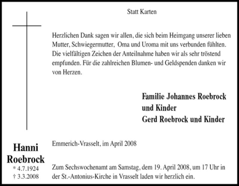 Hier finden Sie alle Traueranzeigen aus der Zeitung, die bisher für Hanni Roebrock erschienen sind. Weitere Traueranzeigen, die in der Zeitung erscheinen, werden hier ebenfalls aufgelistet