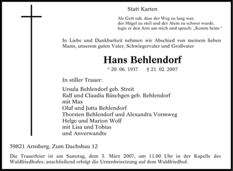 Hier finden Sie alle Traueranzeigen aus der Zeitung, die bisher für Hans Behlendorf erschienen sind. Weitere Traueranzeigen, die in der Zeitung erscheinen, werden hier ebenfalls aufgelistet