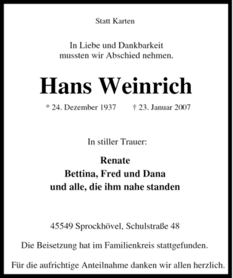 Hier finden Sie alle Traueranzeigen aus der Zeitung, die bisher für Hans Weinrich erschienen sind. Weitere Traueranzeigen, die in der Zeitung erscheinen, werden hier ebenfalls aufgelistet