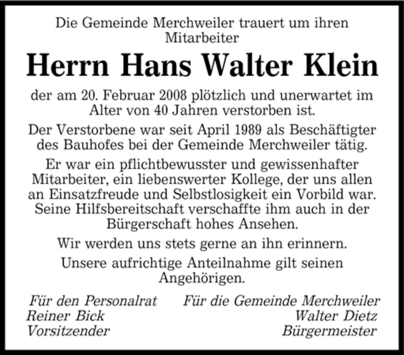 Pflanzen Sie einen Gedenkbaum für Hans Walter Klein