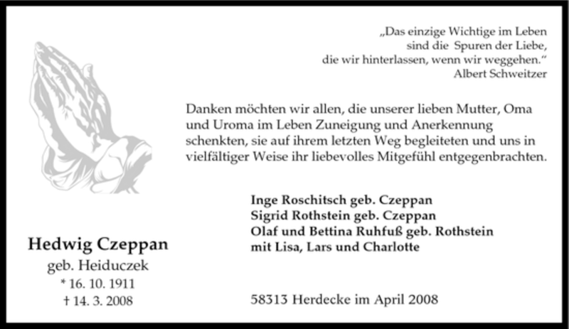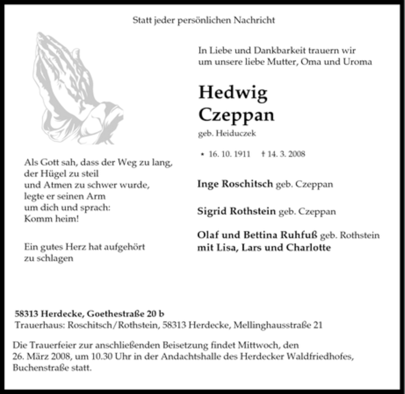 Pflanzen Sie einen Gedenkbaum für Hedwig Czeppan